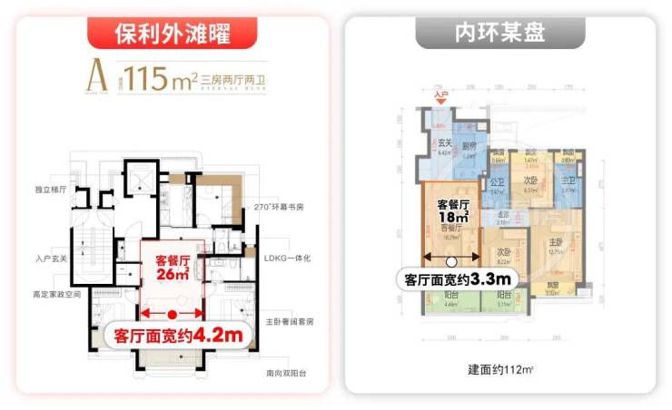 我们以建面约115㎡全能三房、建面约139㎡天幕四房两大主力户型为核心,对标内环同面积段产品逐一拆解,你会清晰看到:它不仅做到了「同面积段体验碾压」,更实现了「小户型平权顶豪配置」,在内环新房市场堪称独一份的存在。
