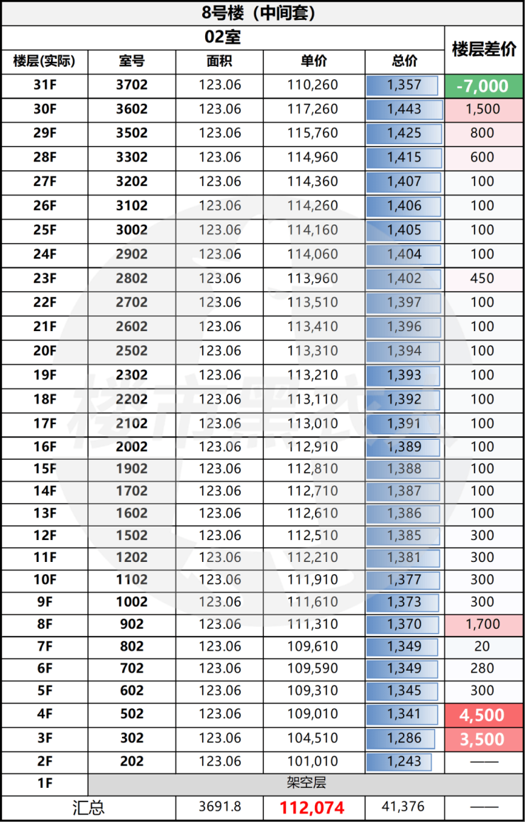 把8# 整栋的一房一价整体来看,你会发现它的定价并不是“均摊”而是很有方向感: