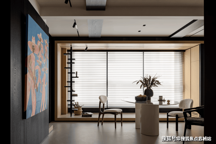 横梁与窗套的材质交织,深色木质的横梁从天花板延伸至空间的深处,带来结构的稳定感与力量感。