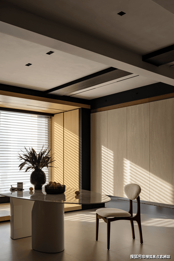 木质饰面的温暖纹路与铆钉的冷峻质感交织,光影透过百叶窗洒落,切割出细腻的条纹,在饰面上轻叩出一段无声的旋律。
