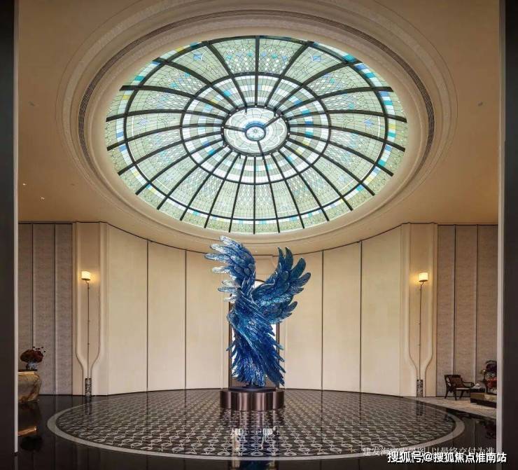 以玉兰门庭—迎归大堂—莳花荟为主轴,敬献步履生辉的归家艺旅:玉兰门庭如繁花盛绽,尊华瑞鳞水景聚运生财,双尊铜狮镇守家宅;迎归大堂流转光影艺韵,百羽栖澜艺术雕塑、芦海宸韵非遗绣作流淌摩登气韵;莳花荟中央会客厅移步异景,献映会客、休闲等雅会.
