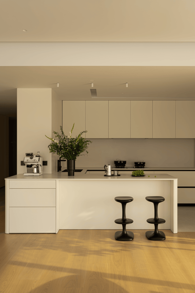 全开放式设计,岛形沙发打破边界,让交流随光影自由发生。午后的光线从侧面洒落,家具被赋予立体的光影层次。