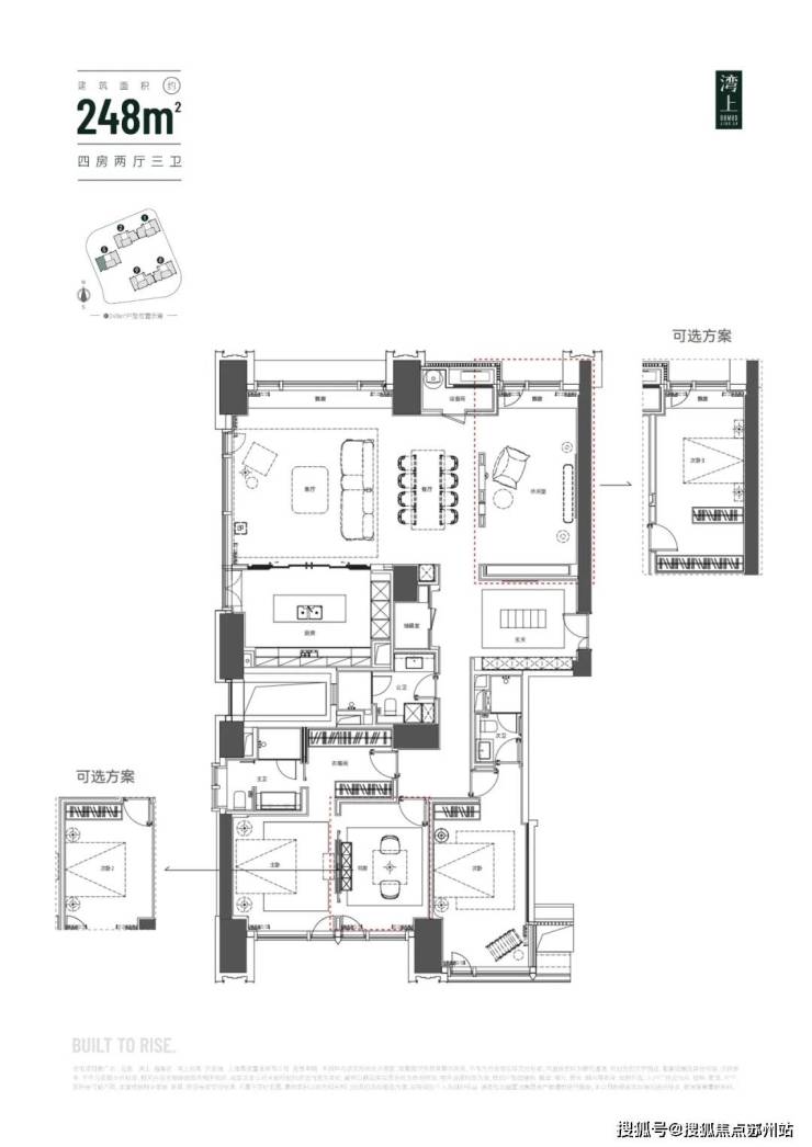 约138-198㎡大三房和定制化248㎡大四房,大师设计户型+国际品牌精装,可以根据家庭结构的变化,自行改造室内空间布局。