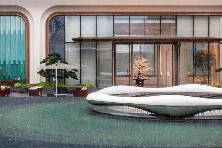 浮光池院水院会客厅,现已实景呈现,水景中央的艺术小品,如一滴水在湖面晕开,泛起阵阵涟漪。