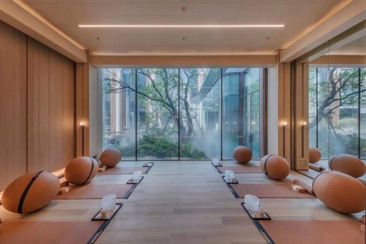 巨型超白玻璃墙,与下沉庭院风景无届链 接,让会所融入叠瀑翠谷之中,而这种巨幅超白玻,采用的是苹果旗舰店同款。
