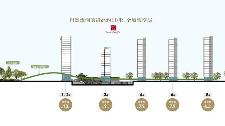 全域架空层,最高达10米,将社区生活平面整体抬升,隔绝尘嚣,营造真正的“悬浮社区”;规划建设人行天桥,直达大宁公园绿地,取之自然,打造无界绿色大宅。