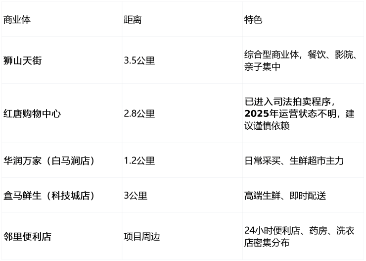 ⚠️ 重要提示 :红唐购物中心已停摆,周边暂无替代型商业体,日常消费依赖社区底商与自驾出行。