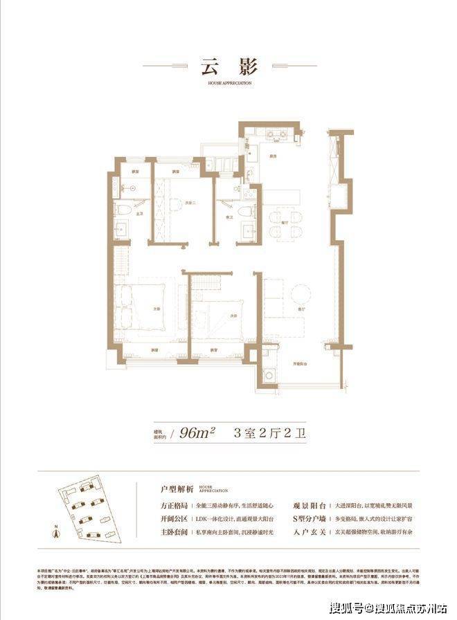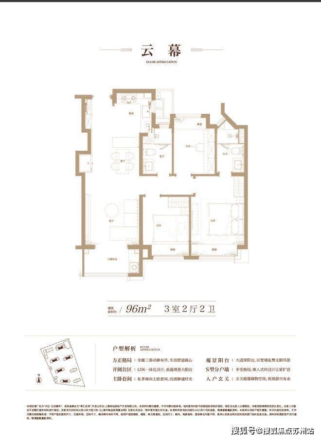 建面约96㎡3房2卫户型,三开间朝南,全卧室带飘窗。整个户型的采光、视野非常出众。