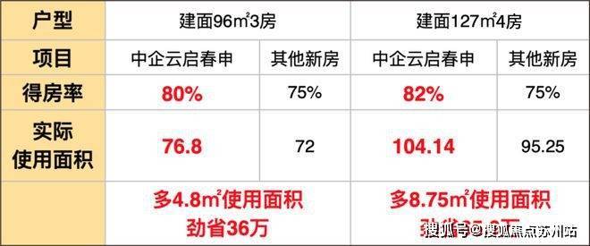 但中企云启春申的得房率却十分惊人:建面约96㎡3房的得房率约80%、建面约127㎡的得房率约82%;