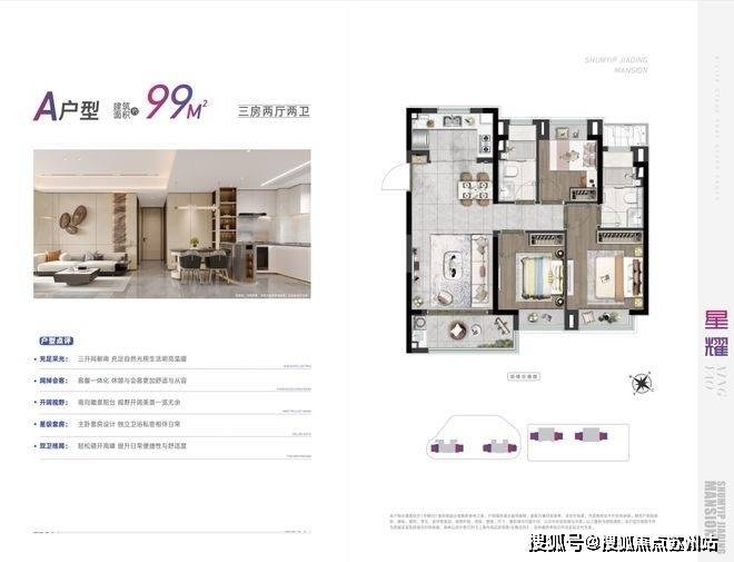 建面约99㎡的三房两厅两卫,很适合一家三口的上车的作品。三开间朝南,南北通透,动静分区,户型非常方正!