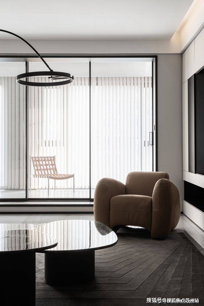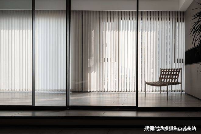 垂直百叶窗将透过大落地窗照进家中的光线均匀切开,营造出光影的效果,既保证了充足的光线又有效保证了隐私性.