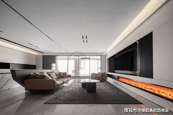 苏州爱情溪岸售楼处电话☎:400-8828-814(售楼处预约看房热线)电视背景墙以通顶的柜体来塑造,白色哑光面柜体将黑色电视机包围其中,与主色调黑白配色相吻合,中间内嵌灯带起到点睛之笔的作用.