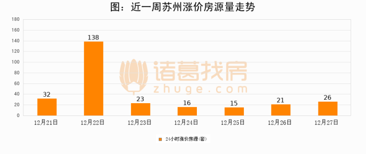 根据诸葛找房数据显示,苏州24小时涨价房源量为26套,较12月26日增加5套,环比上涨23.8%。与此同时,涨价房源占比小幅扩大,业主信心有所提升。