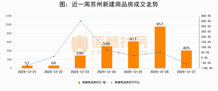 根据苏州市房地产市场和交易管理中心数据显示,2024年12月27日苏州新建商品房成交405套,较昨日减少552套,环比下降57.7%