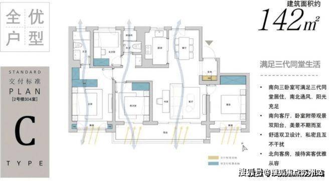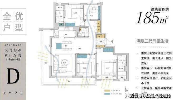 也做到了双卫设计,户型方正,南北通透,动静完全分离.每个功能空间都做到了均好性,适合三代同堂以及二胎家庭,最大程度减少浪费面积.
