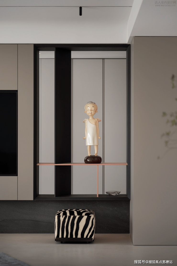 顺着客厅后侧的走廊,就能到达卧室。透过艺术格栅的缝隙,还能望见客厅的光景。