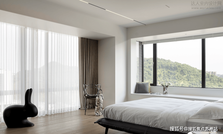 地面上的兔子雕塑憨态可掬,为这片简约增添了些许陪伴。飘窗被做成了一座休息台,躺卧自如,靠在窗边,看车水马龙从水泄不通变得稀疏通畅,阳光从枝叶之间逐渐隐去,时间在流逝,那些顽固的心结也会一一解开。