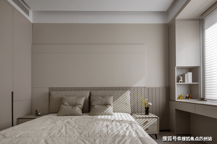 主卧背景墙层次丰富,木饰面护墙板温暖围裹睡眠区,骨格线勾勒出质感,白色岩板点缀给人足够的安全感,整体细腻的质地视觉可见。