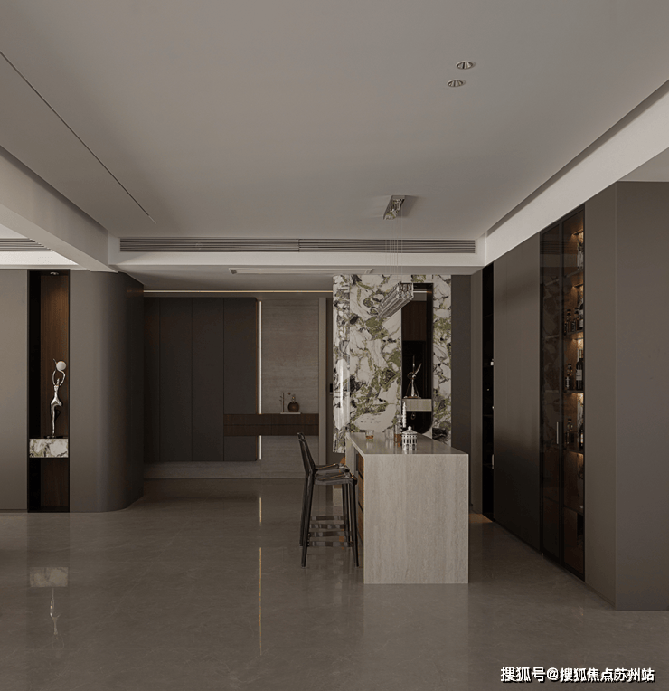 入户玄关,应用了翡翠绿岩板热弯工艺,低奢材质的选择,打造时尚优雅的宜居之境,使空间散发浪漫气息,成为空间的点睛之笔。