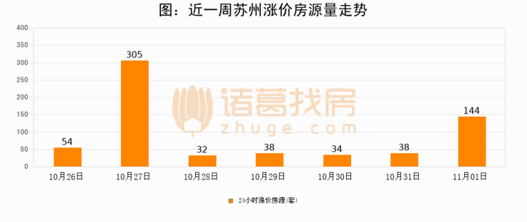 根据诸葛找房数据显示,苏州24小时涨价房源量为144套,较10月31日增加106套,环比上涨278.9%。与此同时,涨价房源占比小幅扩大,业主信心有所提升。