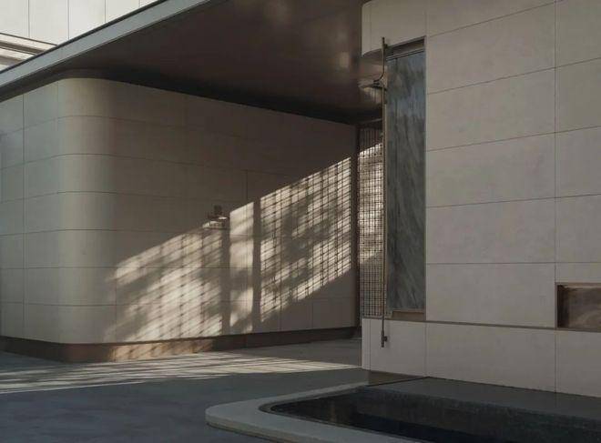 社区入口设计以“隐奢”为核心理念,摒弃传统豪宅项目的张扬符号,转而通过材质、比例与空间叙事的精准把控,传递低调中的精致感。主入口并未采用高耸的门楼或繁复的装饰,而是以米黄色石材与香槟金色金属格栅的组合,构建出克制而优雅的视觉语言。