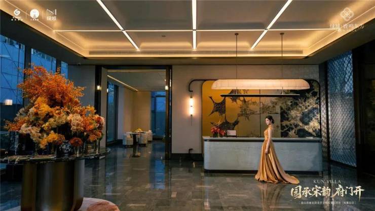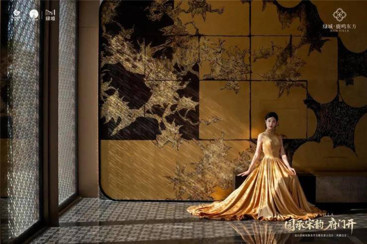 在细节上,绿城又开创性地首次重构了苏工技艺的精妙:比如结合宋式山水画屏与昆玉精雕的“白玉画屏”;比如以铝合金材料转译还原绞角造、榫卯及望柱等元素的“寻杖勾栏”;又比如绿城首次取形昆山市花琼花融合并蒂莲元素打造的“金镂格栅”,这些技艺不但代表着宋式美学“百事精微”的精神,更透露出绿城对产品细节的偏执。