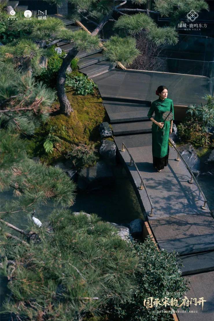 将视线延展,整体构成一幅融贯宋式美学的立体画卷:门庭两侧,两株特选古松苍劲挺拔,以傲然之姿守卫着这处昆山地标门户的庄严气度。