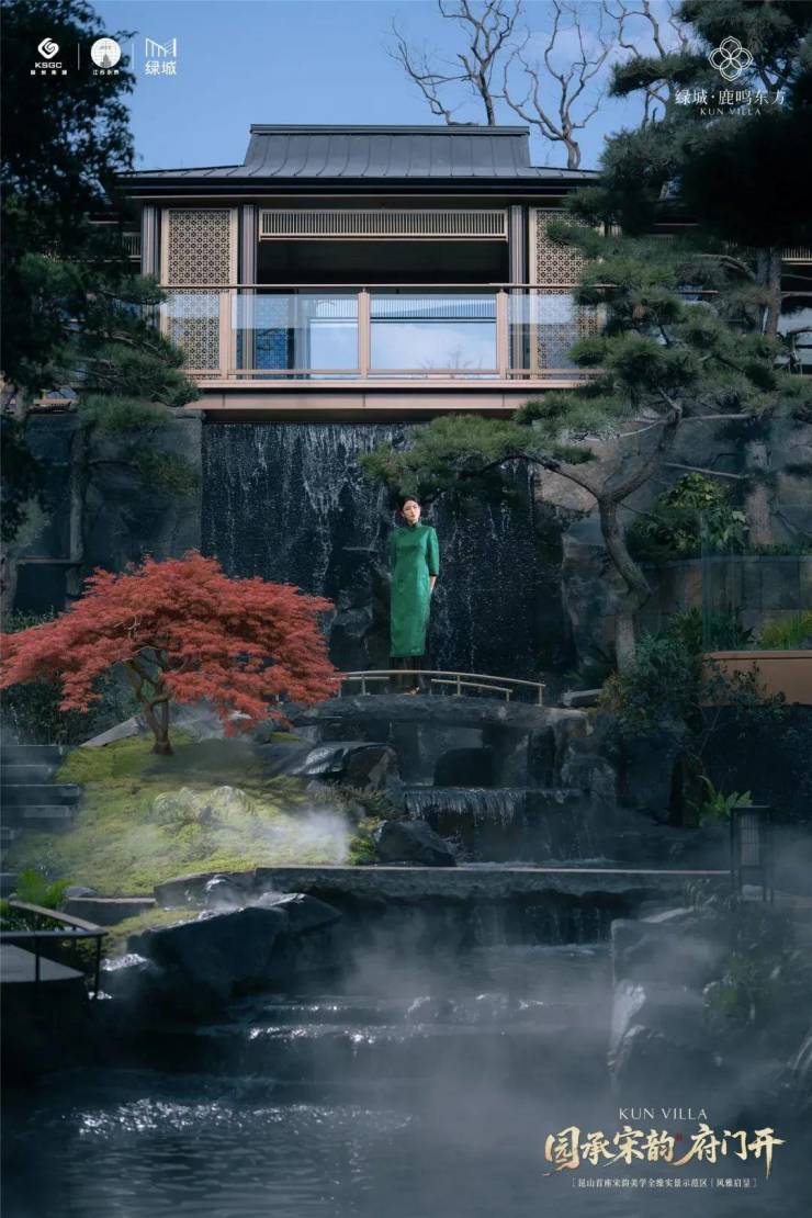 项目通过打造昆山首座下沉式宋风美学庭院,构建起双层洄游动线系统。绿城凭借6米高差的立体庭院布局,塑造出一幅可游可观的现代山水画卷。绿城设计团队取法昆山亭林公园,以自然高差为画布,用画笔把山、水、石、树等元素取用融合,结合池、泉、瀑、溪的立体多维水景系统,勾勒出城市里难得一见的自然式山水立体庭院。