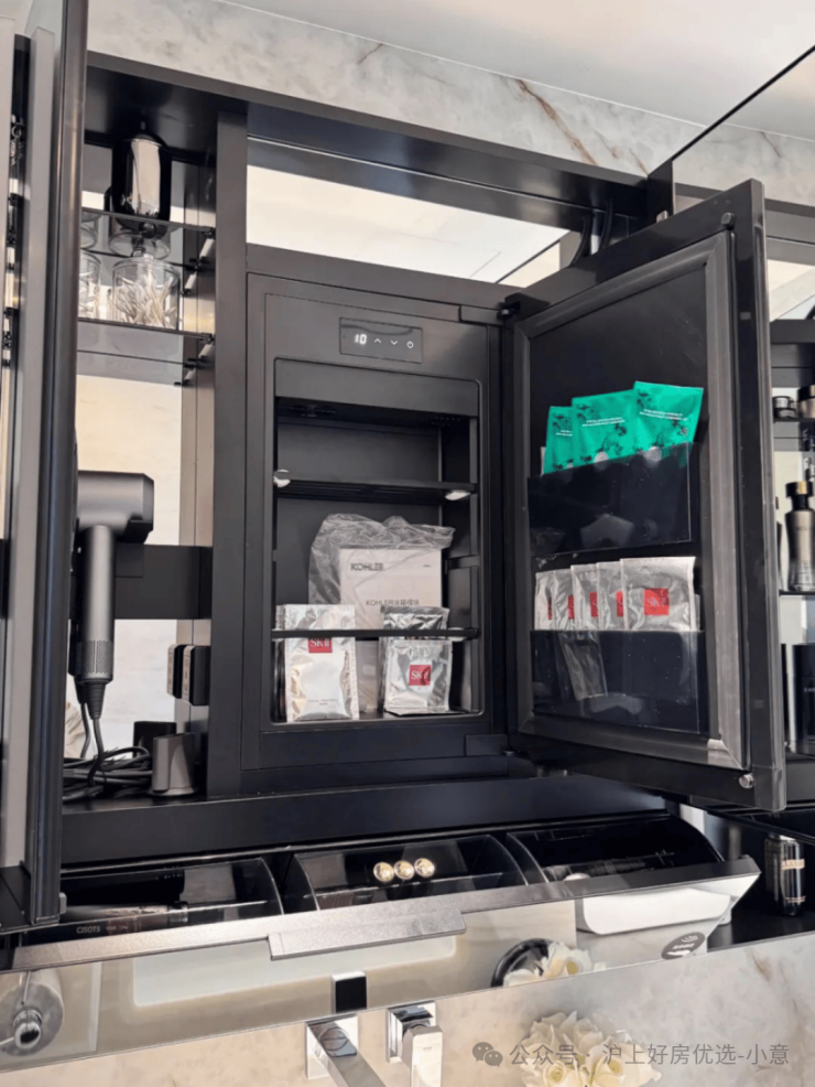 值得一提的是,项目卫生间采用了科勒一体式镜柜,区别于市面上常见的分装拼接柜。这种一体化设计将镜柜、照明、美妆收纳和美妆冰箱功能高度集成,带来更高的美观度与使用便利性!