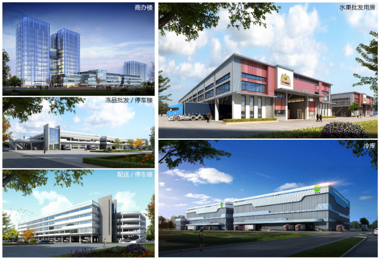在规划中可看出,批发市场部分包括水果批发用房、冻品批发、配送、冷库等楼,商办混用部分底层有部分商业。