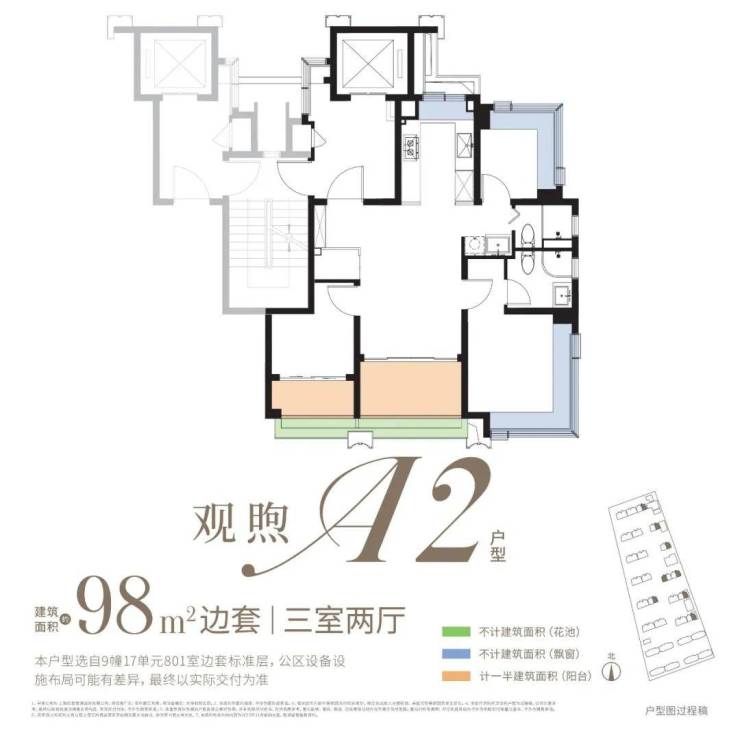 约98㎡3房:类一梯一户、全屋飘窗为标配,双阳台+花池是核心亮点(市面双阳台户型起步多为约110㎡),整体附赠约23㎡,是罕见的高实得率精致户型。