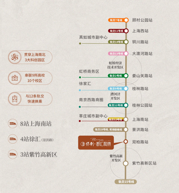 3站紫竹、4站徐汇,可换乘1号线通往徐家汇、新天地;未来19号线建成后,在景洪路站换乘可4站前滩、6站后滩,直达陆家嘴等CAZ核心。