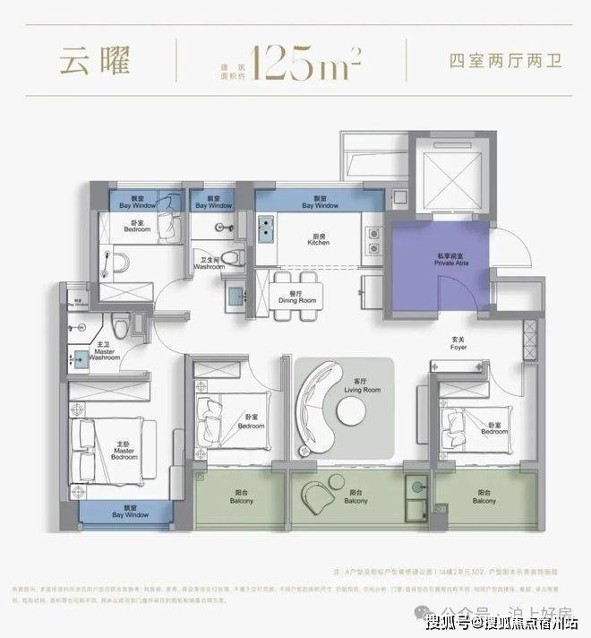建面约125㎡为松江板块罕见的四开间朝南三阳台户型,三开间卧室朝南,搭配多阳台与飘窗,采光通透。一梯一户同样赋予独享梯厅的尊崇体验。空间上,约3米层高营造大平层气场。横厅连接近10㎡朝南阳台,兼顾生活与观景;北向约3.85米面宽餐厅与厨房等宽,备餐时可与家人互动。主卧南向超大景观飘窗搭配全明主卫,北次卧约9㎡可灵活改造,满足多元需求。