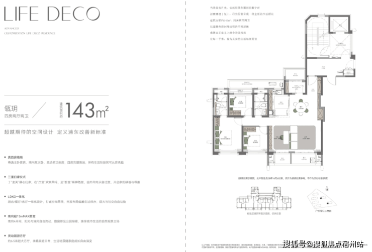 建面约141㎡四房:三开间朝南、横厅LDKB一体化,三阳台+多飘窗,主卧套房带衣帽间,海派精工细节拉满.