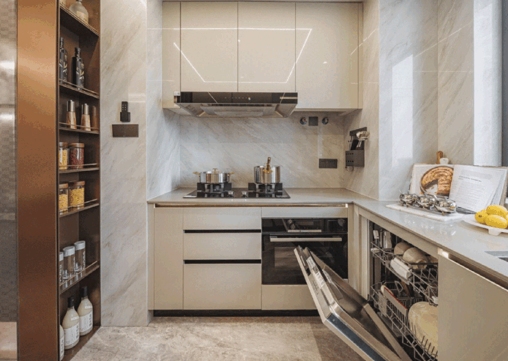 厨房精装产品的使用上,保利精选方太高端系三件套,有效解决中式烹饪过程的油烟烦恼,例如面材采用防油膜更便于清洁;手势开机模式令烹饪更便利,定制更适合东方家庭的幸福智慧厨房。