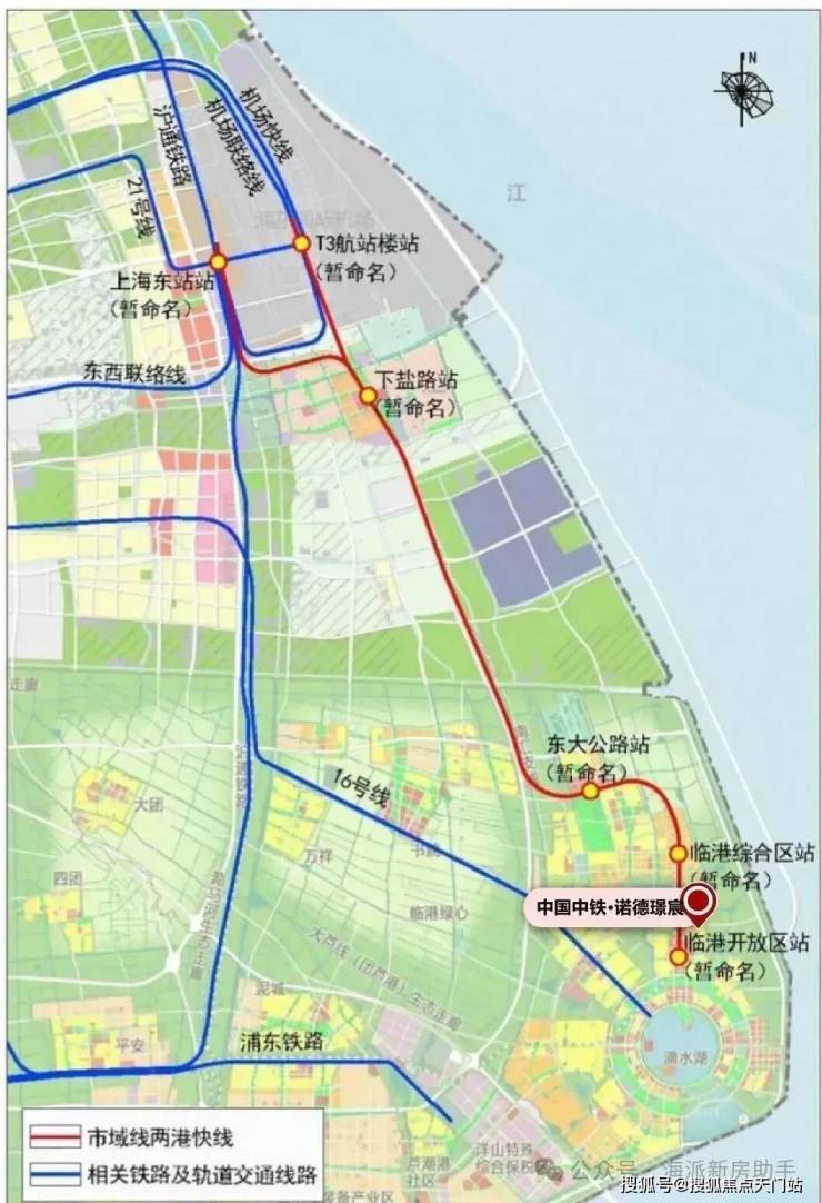 1. **战略区位与交通预期**:项目位于上海重点发展的“临港新片区105金融集聚区”,定位高端。最大的交通卖点是紧邻在建的**两港快线开放区站**(据宣传约1公里)。该线路宣称2025年或2027年通车后,可快速连接浦东枢纽、张江科学城,实现“30分钟通勤圈”。此为项目最大的未来价值赌注。