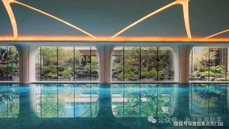 艺术馆般室内无边际泳池,在内部空间设计上,微微拱起的穹顶像云朵漂浮在上空,两侧的柱子成花瓣般的典雅造型,向上延伸,形成独特的记忆点。中央庭院一侧的落地幕墙玻璃,实现自然景观的室内延伸感。泳道尽端的景泰蓝背景墙,更是加强了空间的奢华氛围。