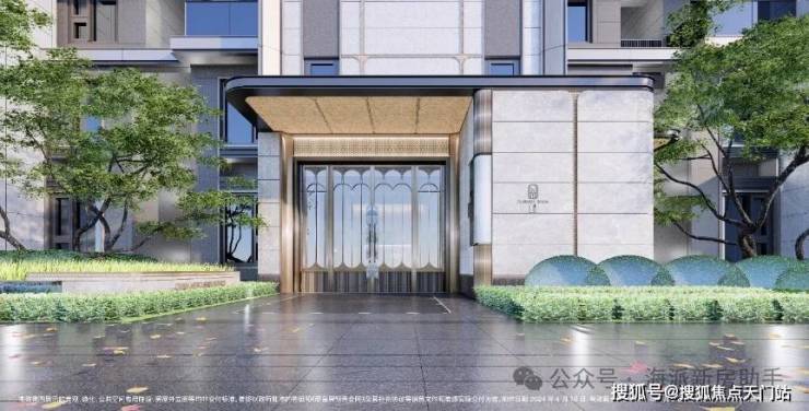 酒店式门廊作为归家的第一道风景,招商臻境以空间大尺度与高级奢石的材质使用将尊崇的归家礼遇感拉满。近50米宽,高度约5.3米高,开口约11米长的高规格酒店式大门。选用了贝金米黄石材作为墙面主材,墙裙用印度蓝石材做装饰。两侧甄选了两颗名贵的罗汉松,有着恭迎归家的美好寓意。