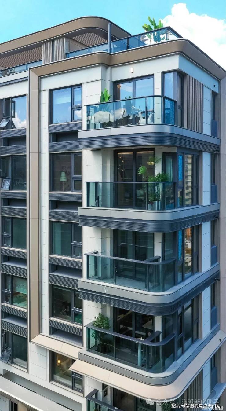立面建筑上,招商臻境转译武康大楼和绿房子的曲线,设计了微弧阳台。首三层设置了贝金米黄石材基座,层间运用银白色和仿木纹色金属装饰线条,顶部设计了干净利落的玻璃塔冠。提升的窗地比和种种材料交织融合成独属于现代海派臻系的立面特色。