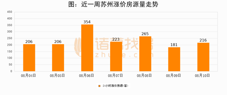 根据诸葛找房数据显示,苏州24小时涨价房源量为216套,较08月09日增加35套,环比上涨19.3%。与此同时,涨价房源占比小幅扩大,业主信心有所提升。