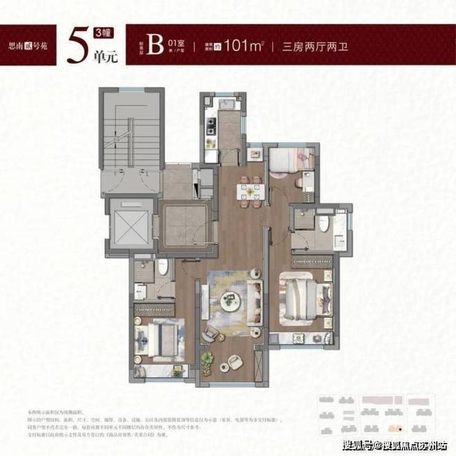 建面约100-101㎡户型,拥类独立电梯厅,无连廊+飞机户型南北通透。