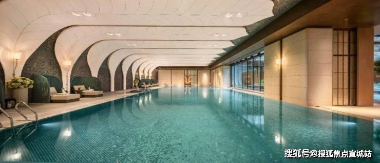 恒温泳池:第一,采用了景德镇烧制的陶瓷马赛克,独特的釉面色彩由景德镇老师傅手工浇筑而成,充满人文艺术底蕴;第二,羽毛天花造型,由600余件铝板打造,表面采用了仿贝壳纹的艺术漆处理,带来松弛度假感;第三,不仅配置了约25m×10m的4道泳池,还采用了奥运会同款空调除湿系统,彰显高档品质细节!