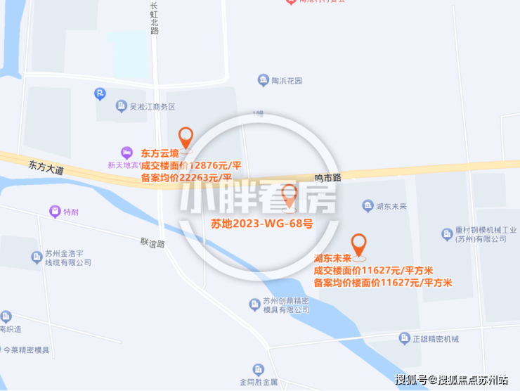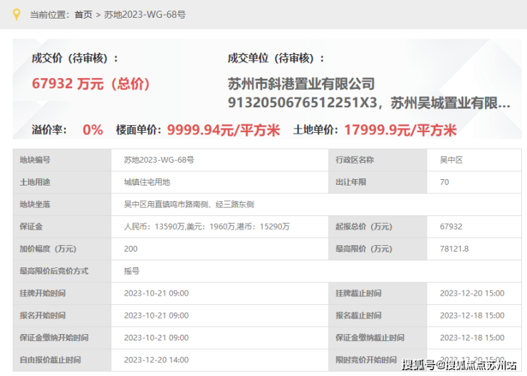 雁云庭,即苏地2023-WG-68号地块,位于吴中区甪直镇鸣市路南侧、经三路东侧,是2023年12月20日,斜港置业&吴城置业&甪直房地产以底价67932万元竞得,成交楼面价10000元/平。