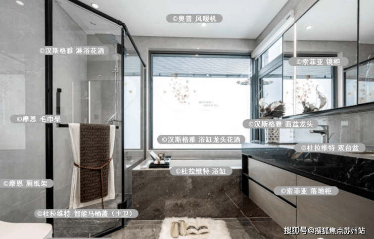 卫浴四件套—— 浴缸、面盆、座便器、智能马桶盖(主卫),更是精选百年德系卫浴品牌 杜拉维特; 龙头和花洒,精选的是 花洒界天花板汉斯格雅;还有 索菲亚的落地柜/镜柜,摩恩的厕纸架、毛巾杆等,星级酒店的品质生活一步到位。