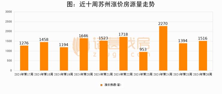 从调价房源来看,第26周苏州涨价房源1516套,较上周上涨8.8%。与此同时,26周涨价房源占比提升0.64个百分点,业主信心持续恢复。