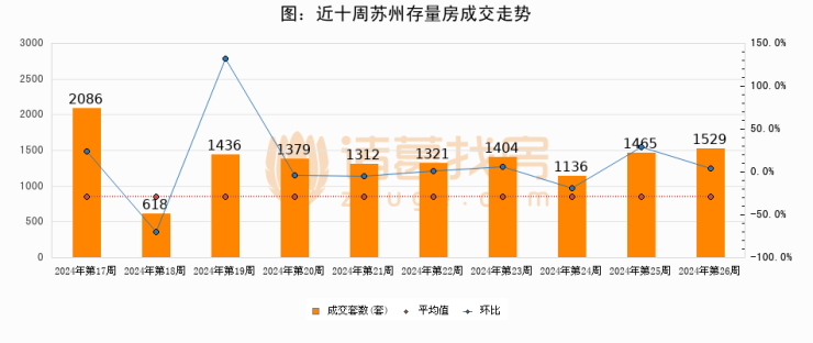 存量房方面,第26周苏州存量房成交1529套,较上周增加64套,环比上涨4.4%。从近十周成交走势来看,周均成交套数为1368套,本周高于平均水平11.8%。