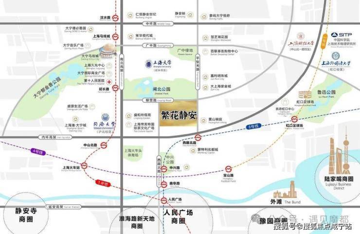 繁花静安位于静安区中部,地处“南京西路-静安寺-苏河湾”黄金三角腹地,向西紧邻静安寺商圈,向东衔接苏河湾滨水区,向北联动大宁国际商务区,向南靠近人民广场核心区。这一区域是静安“十四五”规划中重点打造的“中央活动区”,也是上海主城功能最集中、资源最密集的板块之一。