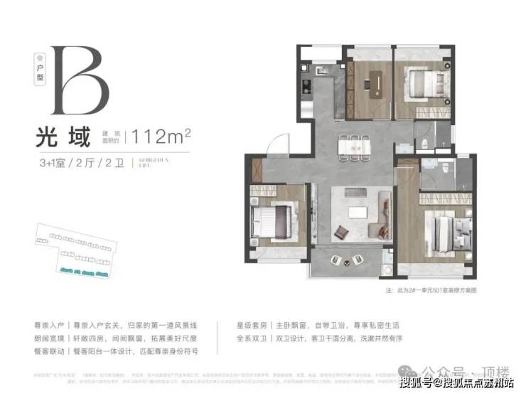 👉 112㎡四房两卫:罕见“3+1”灵动空间,4飘窗+独立玄关,得房率82%,总价357万起;