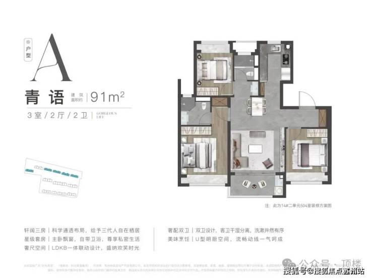 👉 91㎡三房两卫:三开间朝南,全屋3飘窗+开敞阳台,主卧套房设计,得房率78.5%,总价285万起;