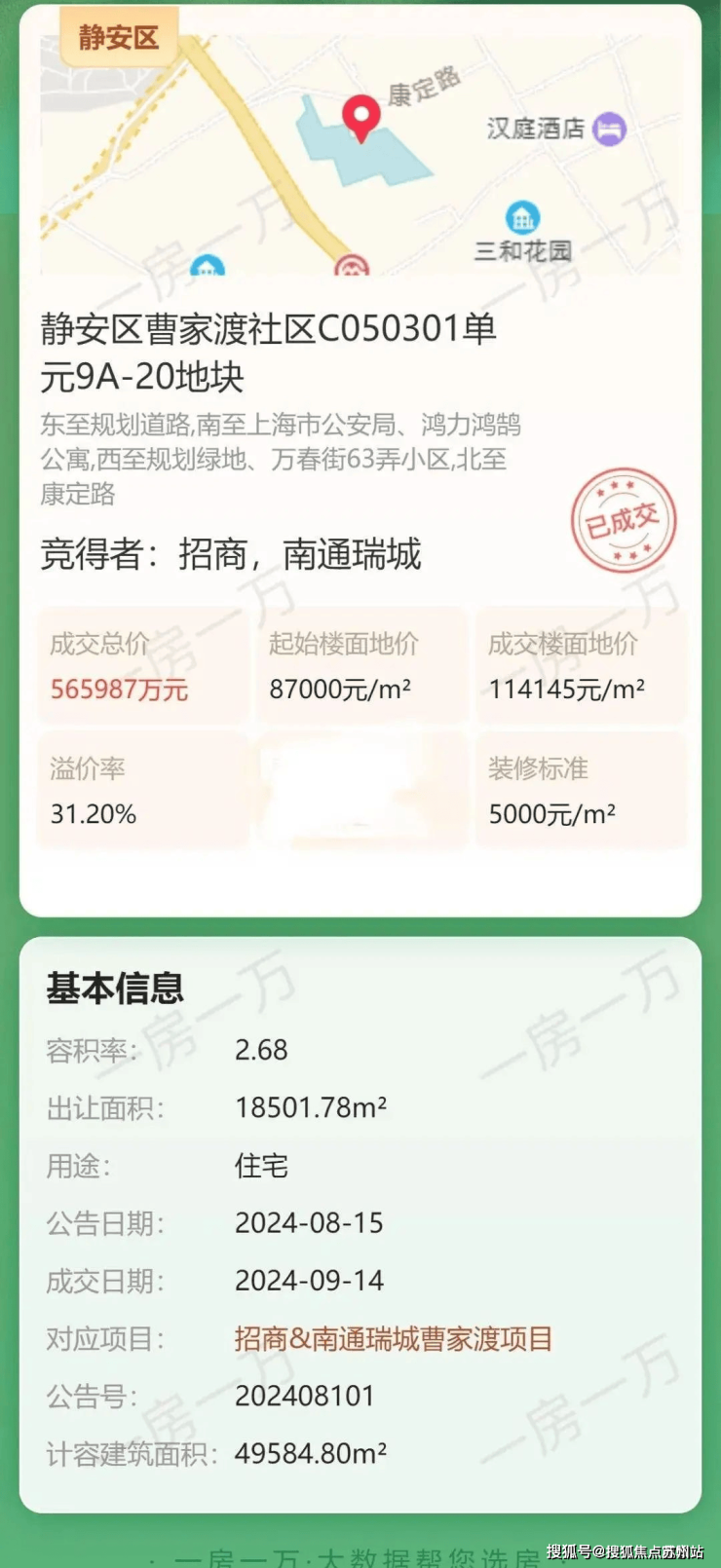 静安区曹家渡社区C050301单元9A-20地块吸引4位竞买人,经过163轮竞价,由太仓沙桥置业有限公司(招商蛇口)与南通瑞城置业组成的联合体以56.6亿元竞得,成交楼板价超11.4万元/㎡,溢价率高达31.2%.